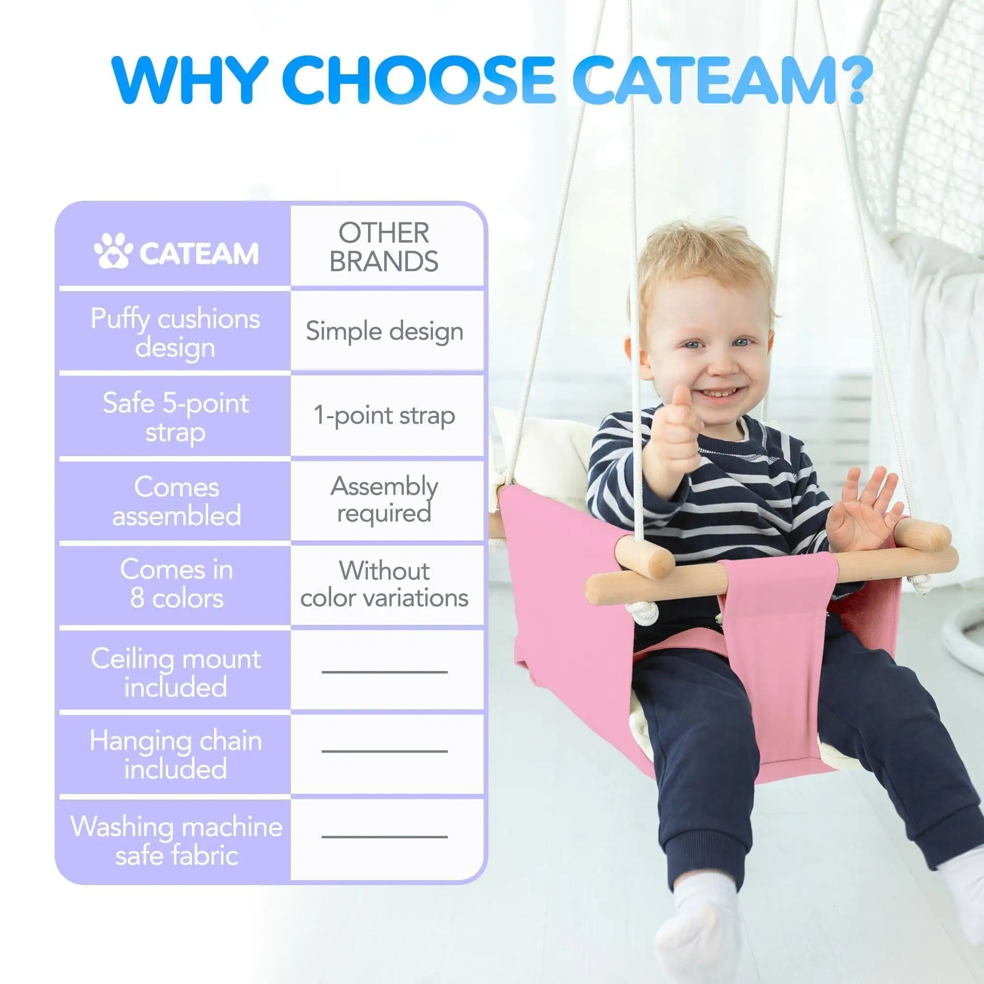 Secure and Safe Design - Never compromise your little one's safety with this indoor/outdoor baby swing! Suitable for ages 1 - 4 years old, it features a 5-point harness belt attached to the toddlers swing seat to keep your kid securely fastened. Made Extra Cozy - We use untreated and polished wooden dowels for our kids swings. The hanging chair features soft upholstery fabric and 2 pillows with skin-friendly polyester stuffing, which you can put together for extra comfort. Durable for Daily Use - Our hammock swings soft canvas is machine washable. This sturdy baby/toddler swing seat measures 16 x 16 inches (40 40 cm) with a capacity of 110 lbs (50 kgs). It also comes with heavy-duty installation hardware. CEILING MOUNT INCLUDED Comes Fully Assembled - Skip long hours of set up with this ready-to-use baby swing set! Its designed with a simple height adjustment system. Before/after installation, you only need to adjust the ropes' length to your preferred height. Suitable for Indoor and Outdoor Use - The baby hammock swing can be installed in the living room/babys room, porch, backyard or garden area. To keep this infant swing set in best shape, install it in an area protected from harsh weather conditions.