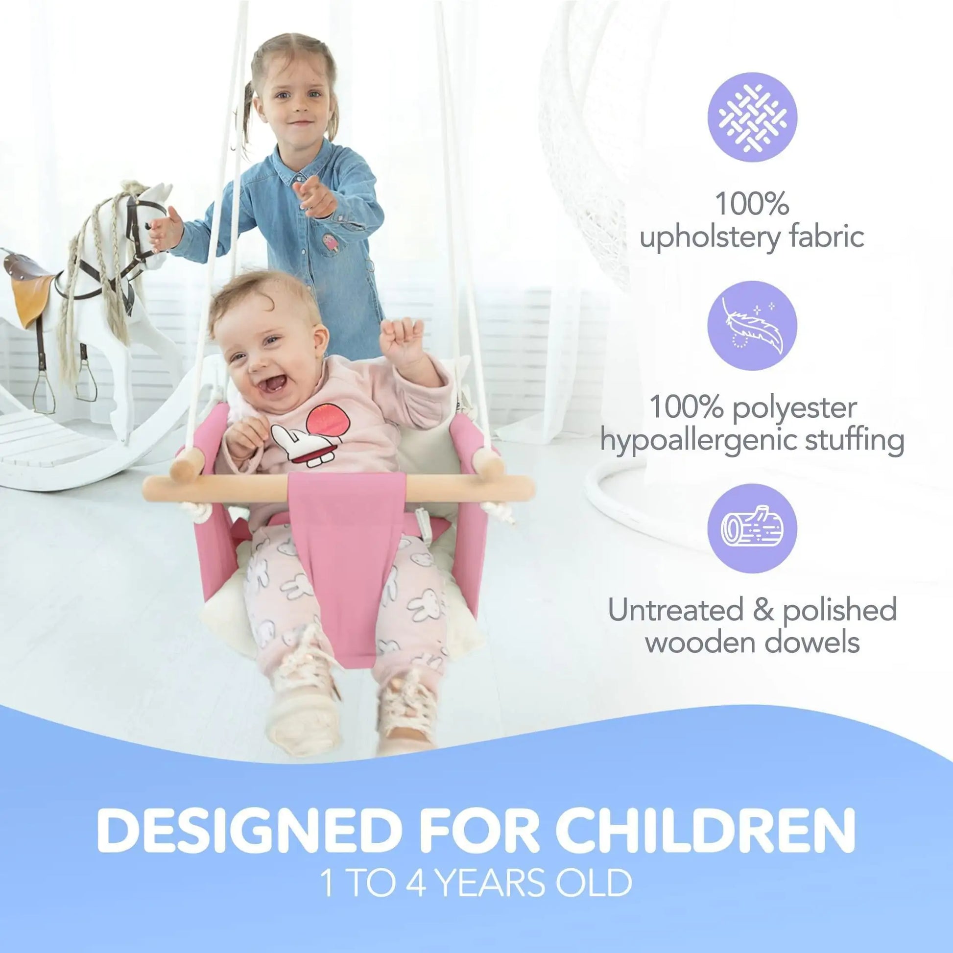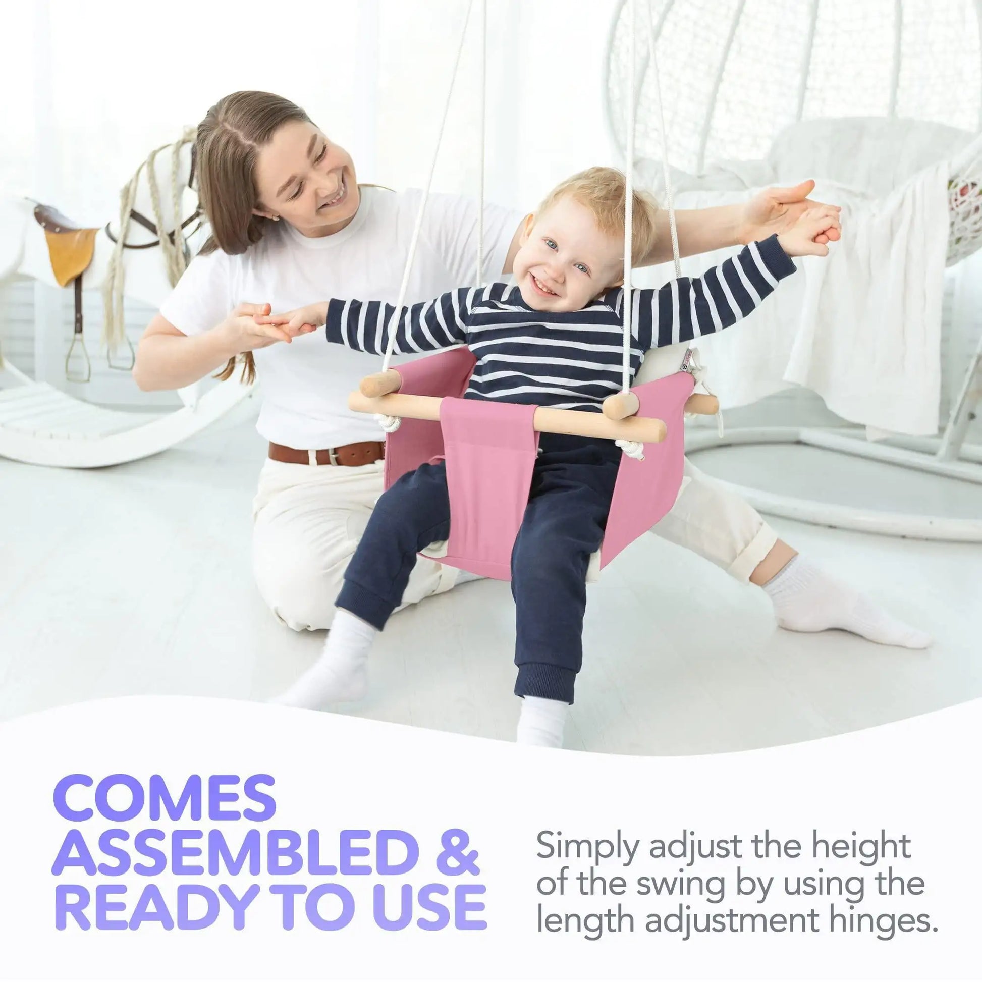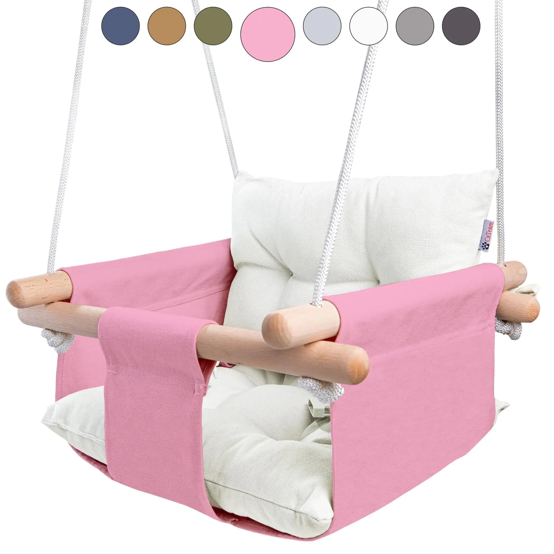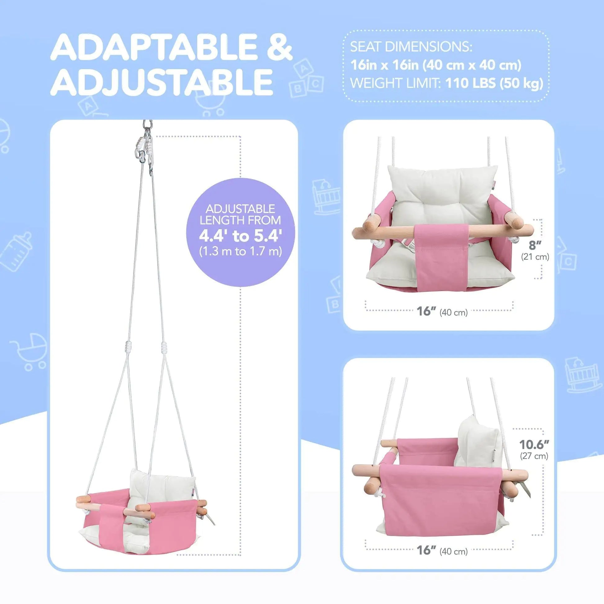 Pink Canvas Baby Swing Wooden Hanging Swing Seat Chair with Safety Belt Durable Baby Swing Chair Outdoor and Indoor Swing for Kids Mounting Hardware Included Pink